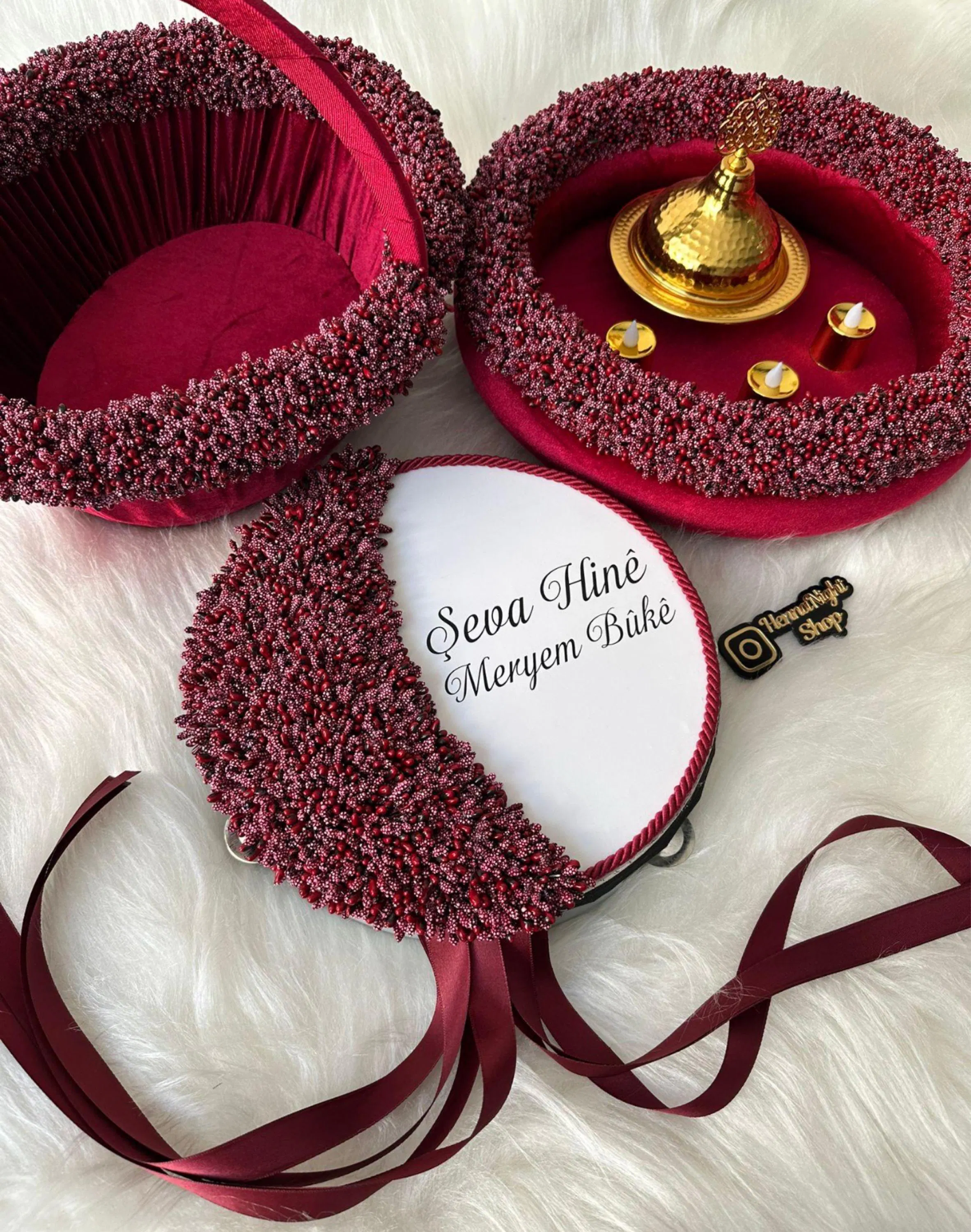 Verschönern Sie Ihre Kina Gecesi- oder Henna-Feier mit diesem wunderschönen Henna-Korb- und Tablett-Set! Mit seinem weichen Samtbezug in einem satten Burgunder-/Rosaton und den zarten floralen Verzierungen eignet sich dieses Set perfekt zum Aufbewahren und Präsentieren von Henna-Kegeln, Kerzen, Süßigkeiten oder kleinen Gastgeschenken.